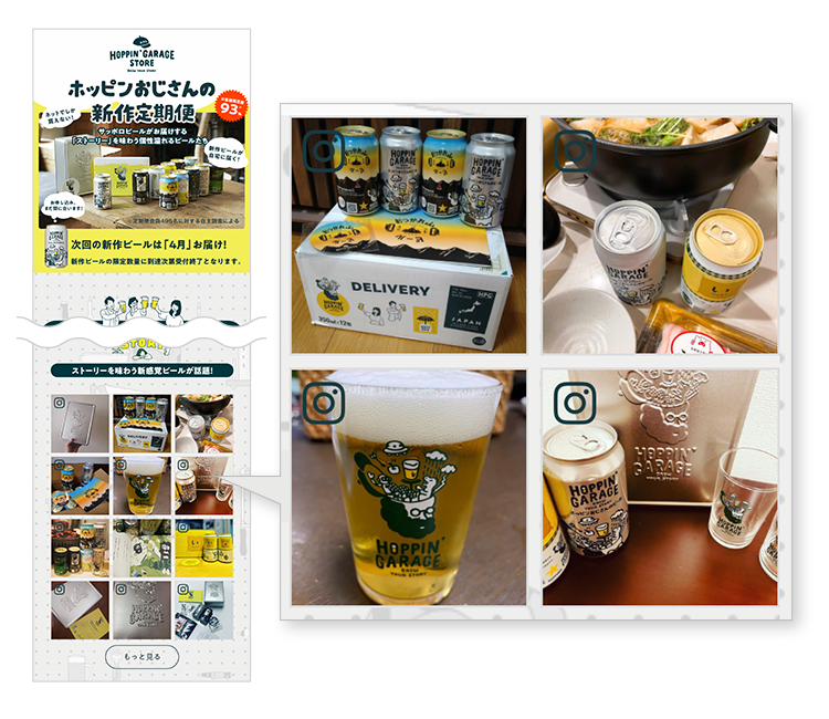 HOPPIN’ GARAGEの会員制定期便サービスの新規顧客獲得向けLPに、Letroを活用したUGCの掲載を開始しました。企業発信の商品情報の訴求に加えて、顧客視点のリアルな感想やビールと過ごす時間を写真と共に掲載することで、購入検討層に対して自然な形で購入の後押しになる情報を提供し、顧客体験及び獲得効率の向上を目指しています。