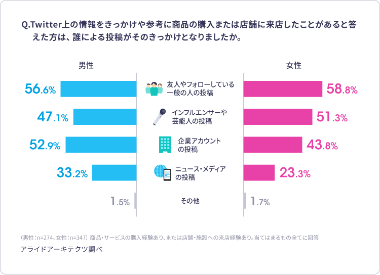 男女別で見ても、「一般ユーザーの投稿」がもっとも購買・来店のきっかけを作っていることが分かります。次いで多い回答は、男性は「企業アカウントの投稿」、女性は「インフルエンサーや芸能人の投稿」となり、男女で違いがある結果になりました。