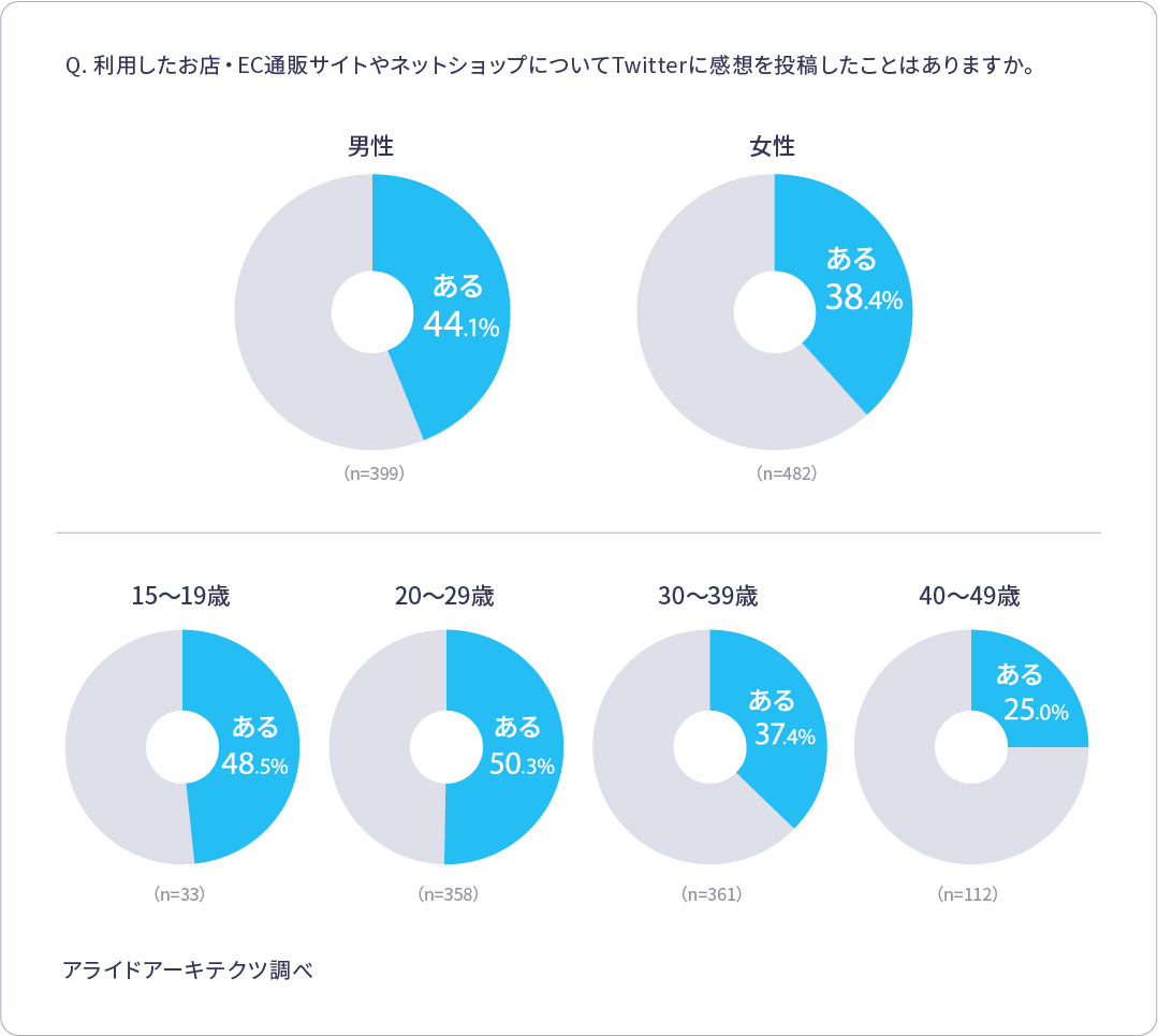 さらに、「お店・EC通販サイト・ネットショップの感想の投稿経験」について聞いたところ、全体の41.0%の人が、Twitter上に何らかのお店・EC通販サイト・ネットショップの感想を投稿したことがあると回答しました。男女別では、男性の44.1%、女性の38.4%となっており、こちらも男性の方が、女性よりも6%ほど多い結果となりました。