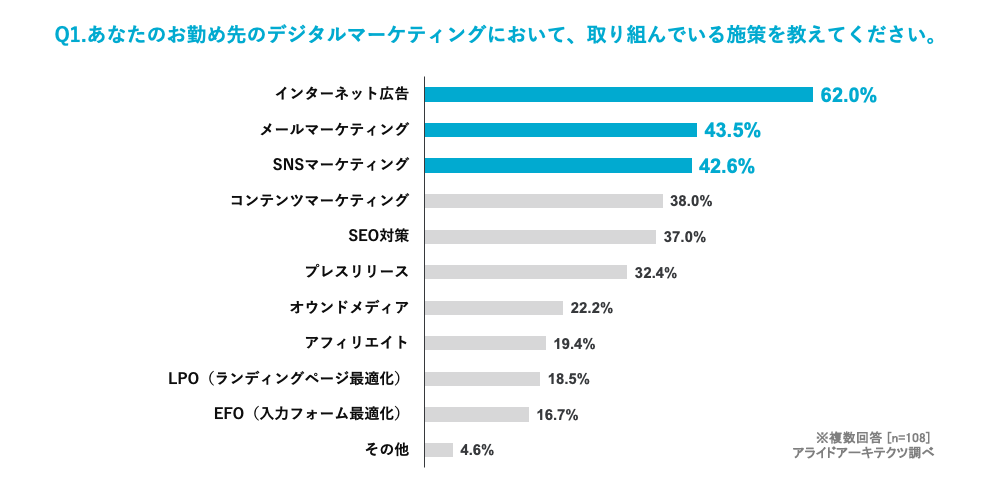 まずはじめに、「所属企業において実施しているデジタルマーケティング施策」について聞いたところ下記の通りとなりました。