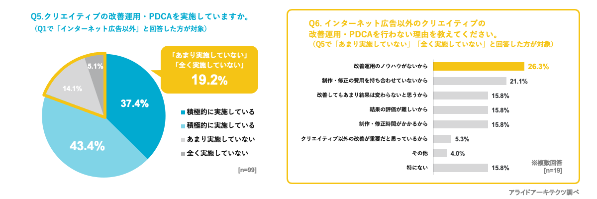 さらに、「あまり実施していない」「全く実施していない」と回答した方に対して「インターネット広告以外のクリエイティブの改善運用・PDCAを行わない理由」について聞いたところ、改善運用のノウハウがない(26.3%)次いで、費用を持ち合わせていない(21.1%)が多い結果となりました。クリエイティブ運用のためのスキル不足や制作環境が十分に整っていない企業が多いことが伺えます。
