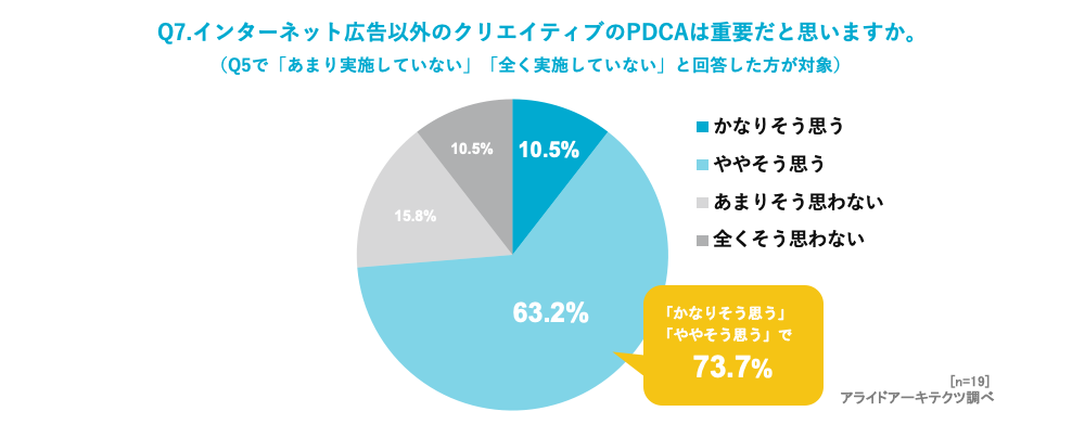 インターネット広告以外の運用を「あまり実施していない」「全く実施していない」と回答した方に対して、「インターネット広告以外のクリエイティブのPDCAの重要性」について聞いたところ、7割強が運用の重要性を感じていることがわかりました。クリエイティブの運用の重要性を感じながらも、運用のためのスキルが不足していたり、環境構築が不十分なために本来実施すべき運用が行えていない企業が多くいることが推測できます。