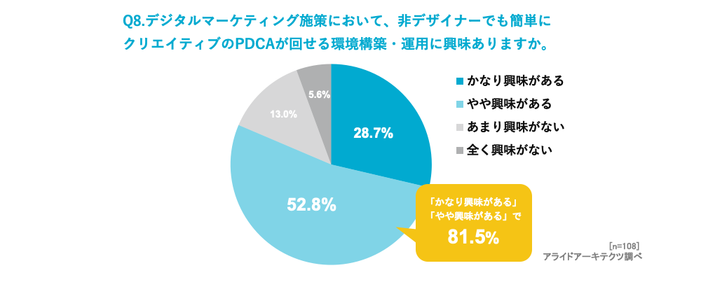 「デジタルマーケティング施策において、非デザイナーでも簡単にクリエイティブのPDCAが回せる環境構築・運用への興味関心」について聞いたところ、全体の8割の方が「興味がある」と回答しました。制作領域の担当者だけでなく、非制作領域の担当者でもクリエイティブの制作が可能となる環境を整えることで、新規リソースを確保し、定常的なクリエイティブ運用の実施及び、運用速度の向上を求めている方が多くいることがうかがえます。