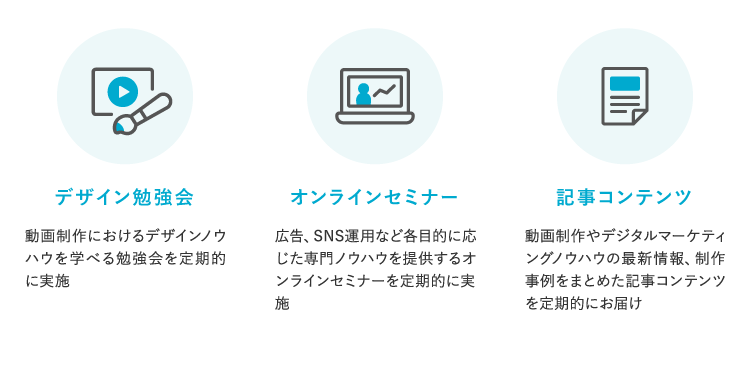 動画制作に関する勉強会を定期的に実施いたします。各媒体に合った動画制作のポイントや、配色やレイアウトといったデザインの基礎知識などクオリティの高い動画が制作できるようになるための情報を提供します。